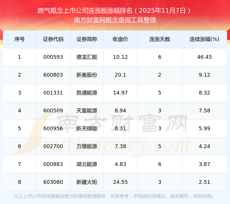 2025年11月7日燃?xì)飧拍钌鲜泄具B漲股漲幅排名