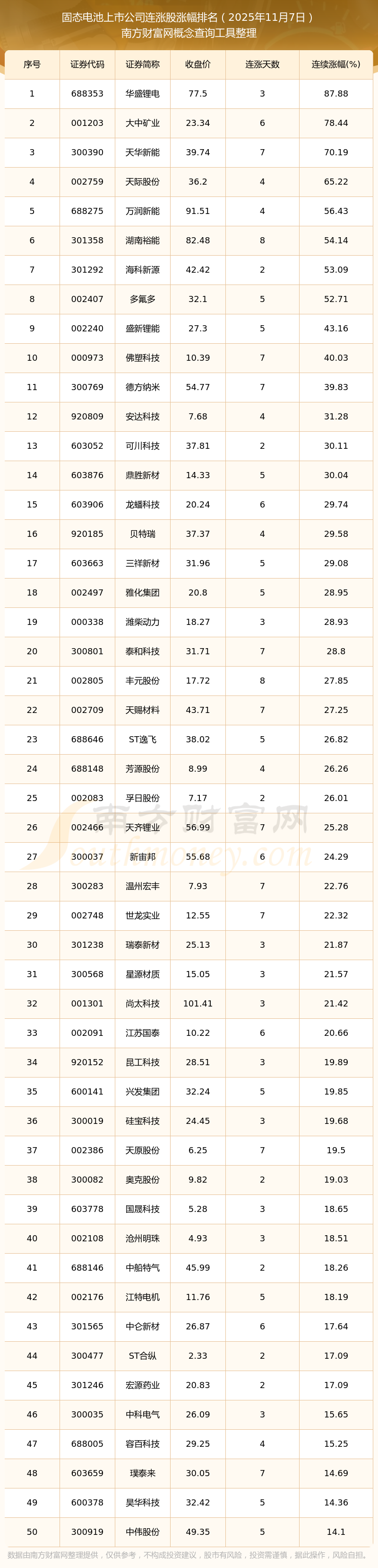 2025年11月7日固態(tài)電池上市公司連漲股漲幅排名