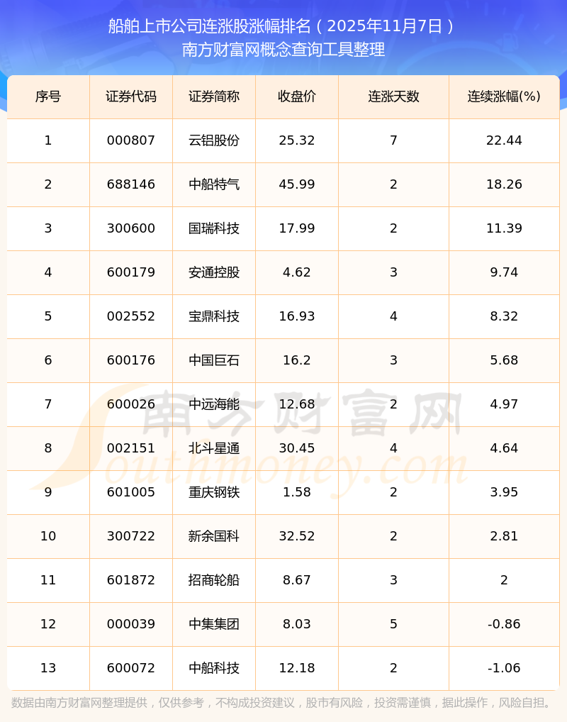根據(jù)南方財(cái)富網(wǎng)概念查詢工具數(shù)據(jù)統(tǒng)計(jì),截止2025年11月7日收盤,船舶上市公司共有13只個(gè)股實(shí)現(xiàn)連漲。其中連續(xù)漲幅較大的個(gè)股有云鋁股份、中船特氣、國(guó)瑞科技等,連續(xù)漲幅分別為22.44%、18.26%、11.39%。