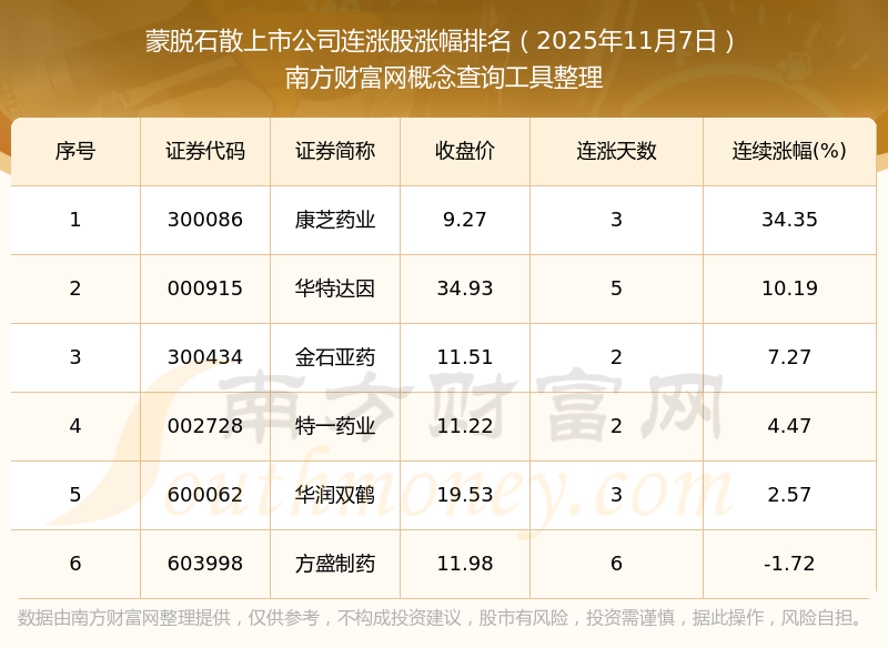 2025年11月7日蒙脫石散上市公司連漲股漲幅排名