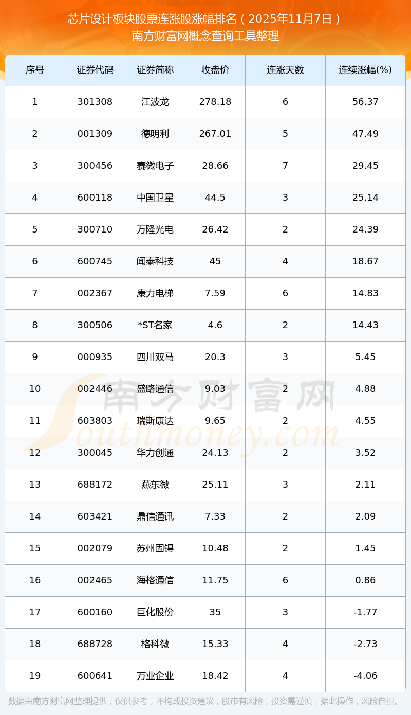 2025年11月7日芯片設(shè)計板塊股票連漲股票漲幅排名