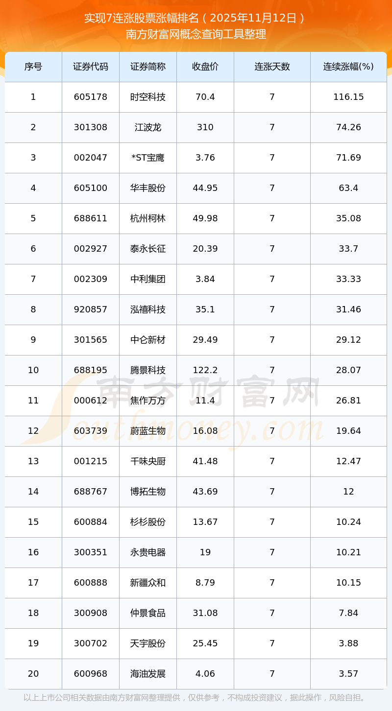 根據(jù)南方財(cái)富網(wǎng)概念查詢工具數(shù)據(jù)統(tǒng)計(jì),截止2025年11月12日收盤,共有20只個(gè)股實(shí)現(xiàn)7天連漲。其中連續(xù)漲幅較大的個(gè)股有時(shí)空科技、江波龍、*ST寶鷹等,連續(xù)漲幅分別為116.15%、74.26%、71.69%。