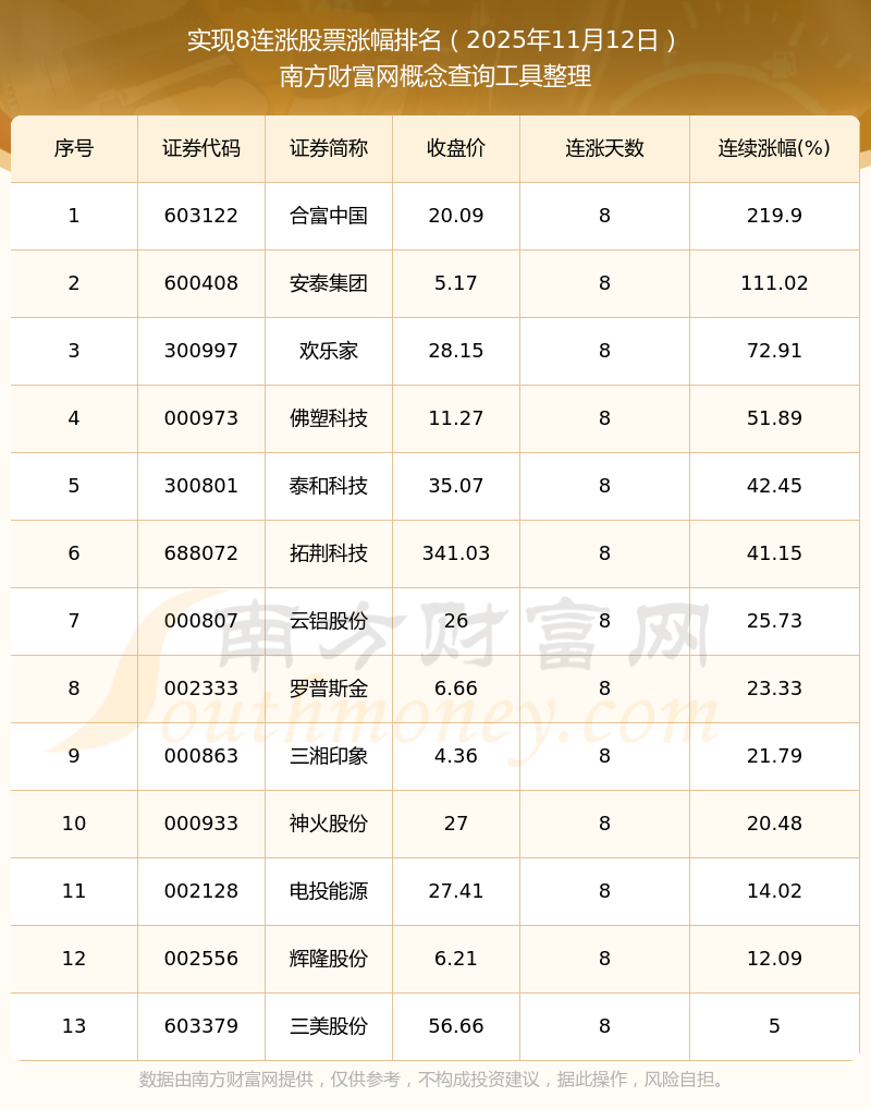 2025年11月12日實現(xiàn)8連漲股票漲幅排名