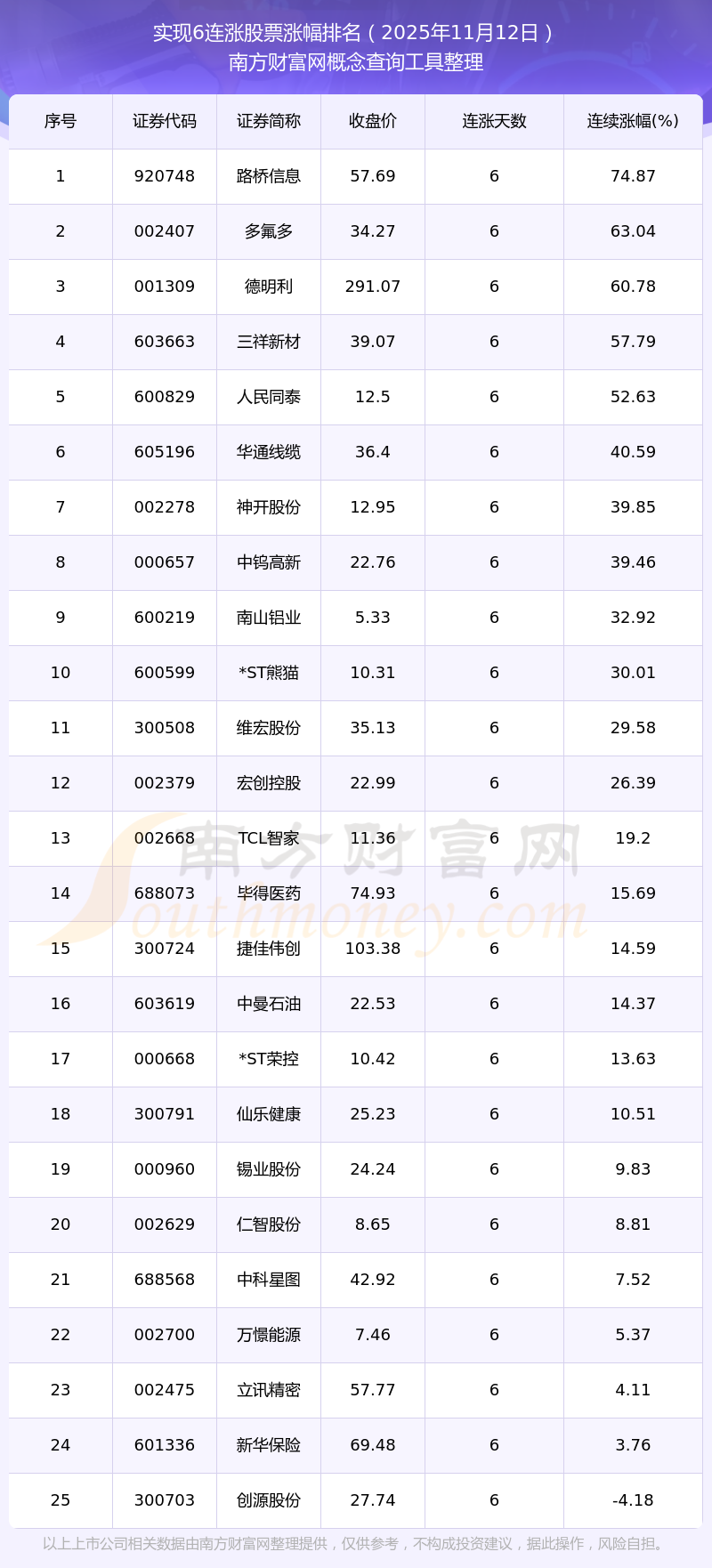 根據(jù)南方財(cái)富網(wǎng)概念查詢工具數(shù)據(jù)統(tǒng)計(jì),截止2025年11月12日收盤(pán),共有25只個(gè)股實(shí)現(xiàn)6天連漲。其中連續(xù)漲幅較大的個(gè)股有路橋信息、多氟多、德明利等,連續(xù)漲幅分別為74.87%、63.04%、60.78%。