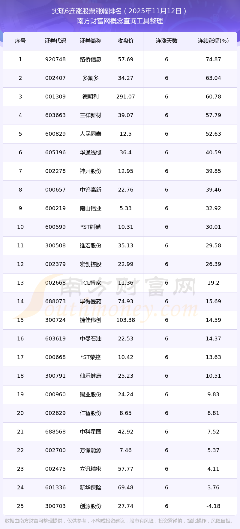 根據(jù)南方財(cái)富網(wǎng)概念查詢工具數(shù)據(jù)統(tǒng)計(jì),截止2025年11月12日收盤(pán),共有25只個(gè)股實(shí)現(xiàn)6天連漲。其中連續(xù)漲幅較大的個(gè)股有路橋信息、多氟多、德明利等,連續(xù)漲幅分別為74.87%、63.04%、60.78%。