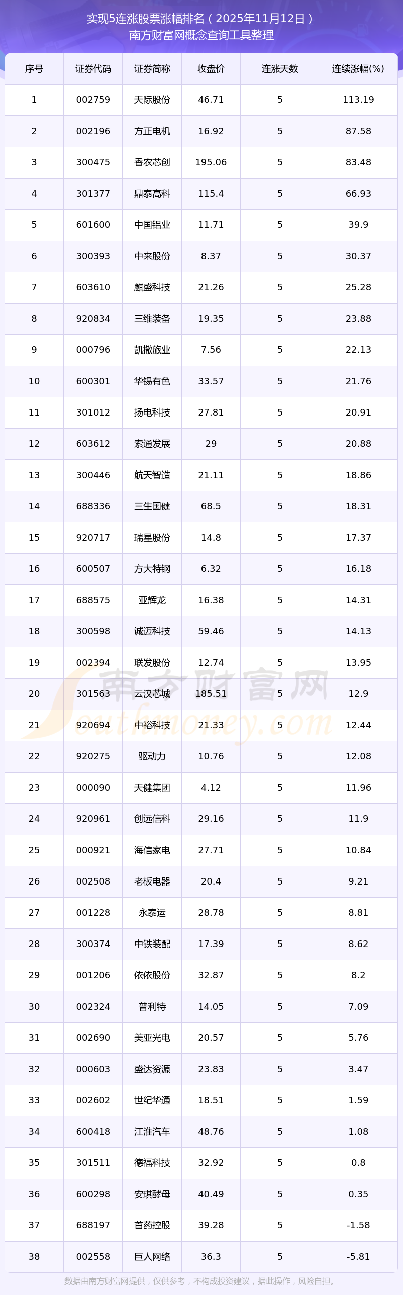 根據(jù)南方財富網(wǎng)概念查詢工具數(shù)據(jù)統(tǒng)計,截止2025年11月12日收盤,共有38只個股實現(xiàn)5天連漲。其中連續(xù)漲幅較大的個股有天際股份、方正電機、香農(nóng)芯創(chuàng)等,連續(xù)漲幅分別為113.19%、87.58%、83.48%。