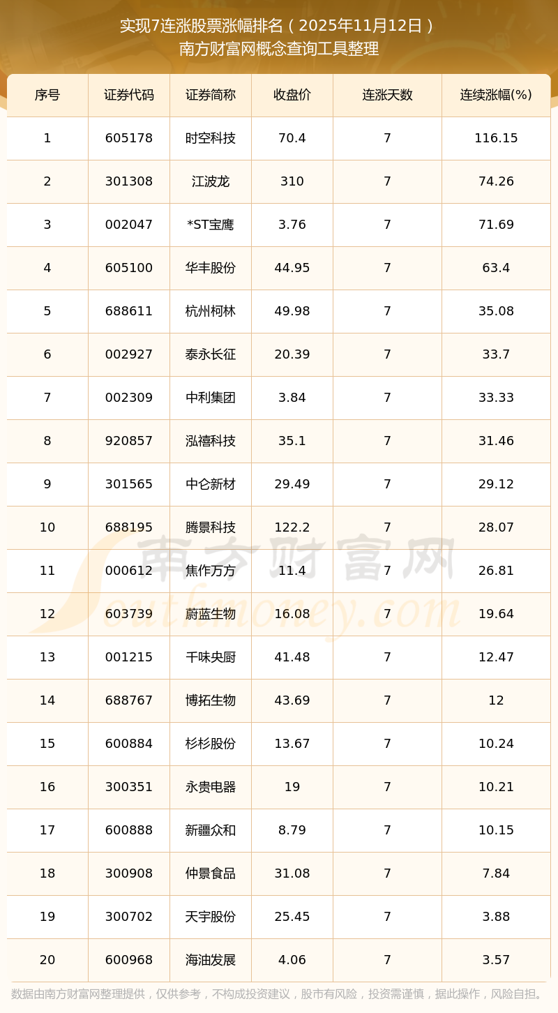 2025年11月12日實(shí)現(xiàn)7連漲股票漲幅排名
