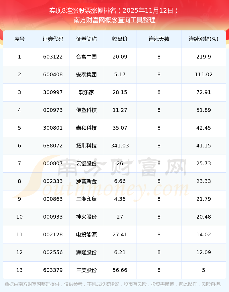 根據(jù)南方財富網(wǎng)概念查詢工具數(shù)據(jù)統(tǒng)計,截止2025年11月12日收盤,共有13只個股實現(xiàn)8天連漲。其中連續(xù)漲幅較大的個股有合富中國、安泰集團(tuán)、歡樂家等,連續(xù)漲幅分別為219.90%、111.02%、72.91%。