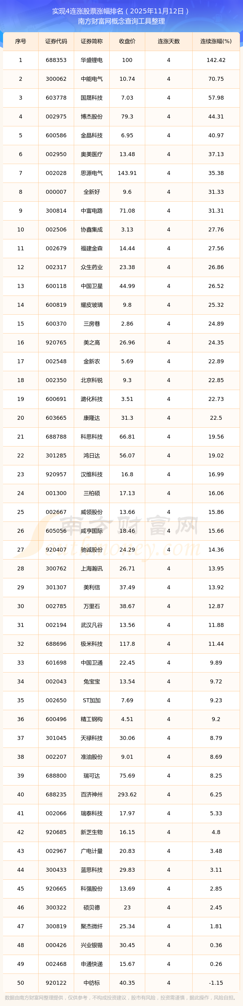 根據(jù)南方財(cái)富網(wǎng)概念查詢(xún)工具數(shù)據(jù)統(tǒng)計(jì),截止2025年11月12日收盤(pán),共有51只個(gè)股實(shí)現(xiàn)4天連漲。其中連續(xù)漲幅較大的個(gè)股有華盛鋰電、中能電氣、國(guó)晟科技等,連續(xù)漲幅分別為142.42%、70.75%、57.98%。