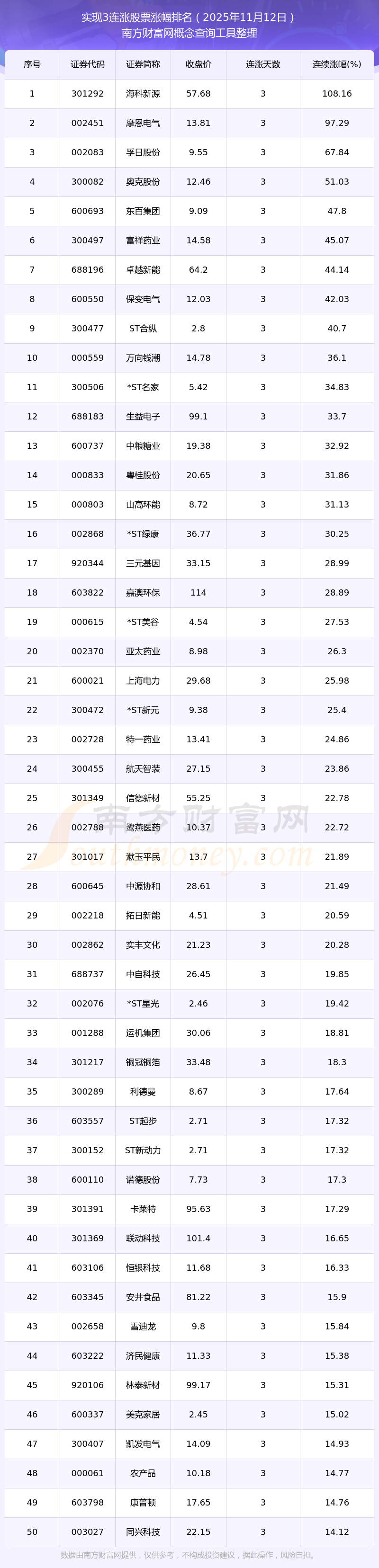 2025年11月12日實(shí)現(xiàn)3連漲股票漲幅排名