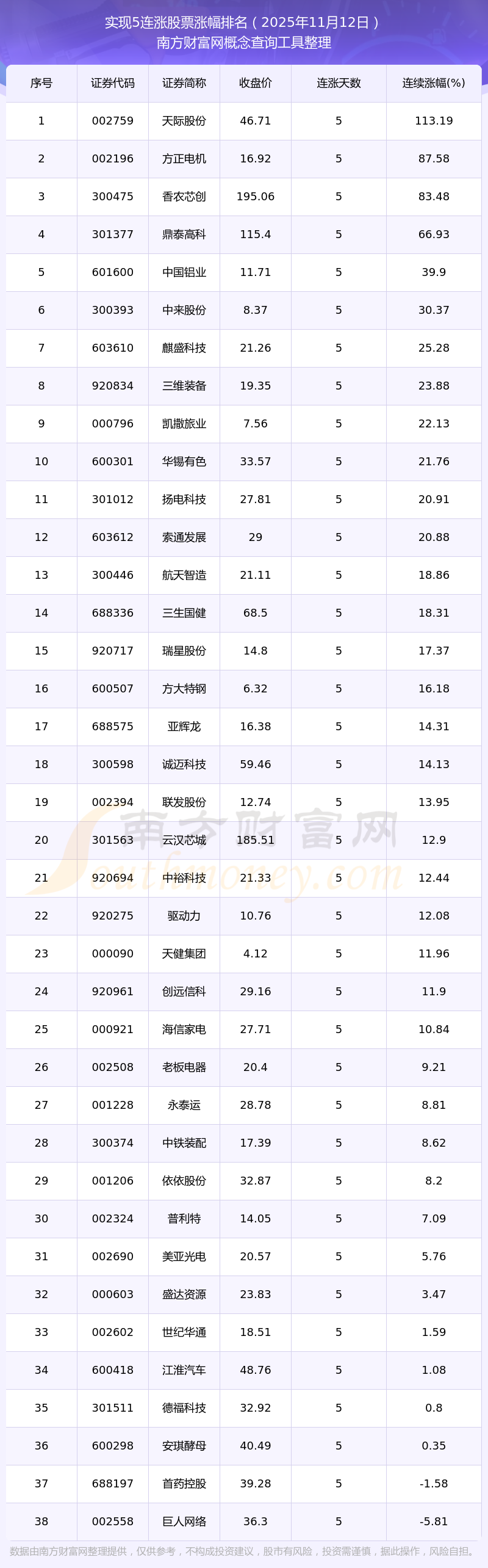 根據(jù)南方財(cái)富網(wǎng)概念查詢工具數(shù)據(jù)統(tǒng)計(jì),截止2025年11月12日收盤,共有38只個股實(shí)現(xiàn)5天連漲。其中連續(xù)漲幅較大的個股有天際股份、方正電機(jī)、香農(nóng)芯創(chuàng)等,連續(xù)漲幅分別為113.19%、87.58%、83.48%。