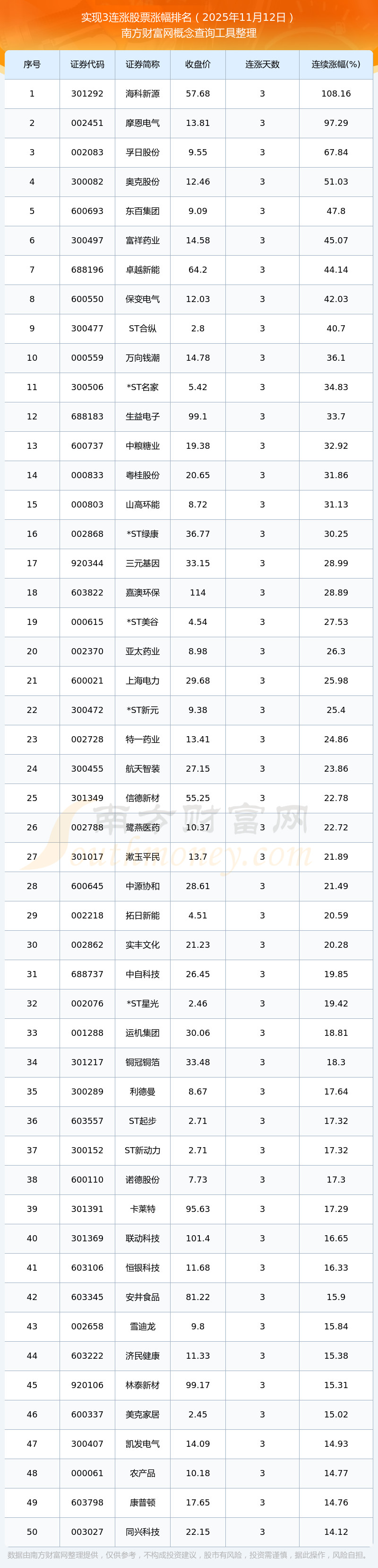 2025年11月12日實(shí)現(xiàn)3連漲股票漲幅排名
