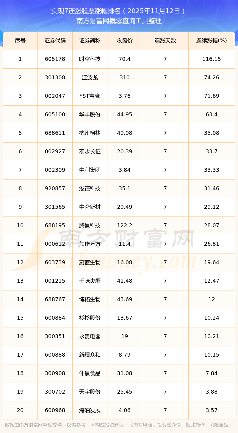 2025年11月12日實現(xiàn)7連漲股票漲幅排名
