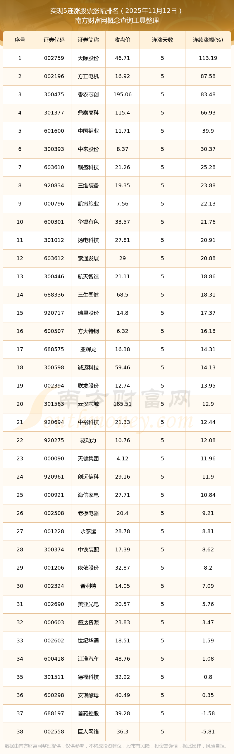 根據(jù)南方財富網(wǎng)概念查詢工具數(shù)據(jù)統(tǒng)計,截止2025年11月12日收盤,共有38只個股實現(xiàn)5天連漲。其中連續(xù)漲幅較大的個股有天際股份、方正電機、香農(nóng)芯創(chuàng)等,連續(xù)漲幅分別為113.19%、87.58%、83.48%。