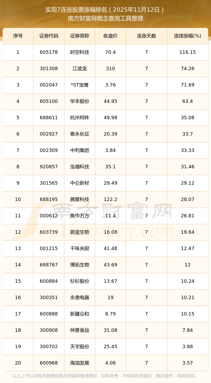 2025年11月12日實現(xiàn)7連漲股票漲幅排名