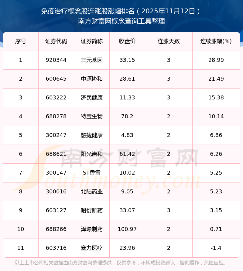 2025年11月12日免疫治療概念股連漲股漲幅排名