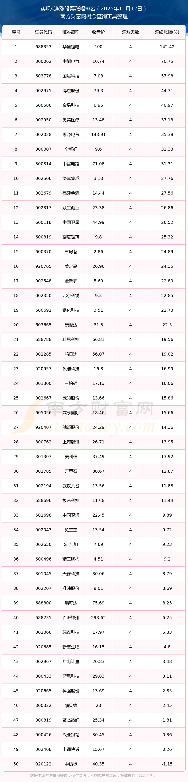 2025年11月12日實(shí)現(xiàn)4連漲股票漲幅排名