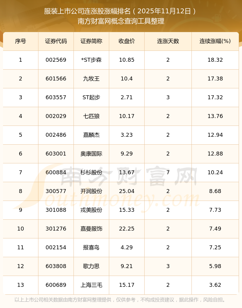 2025年11月12日服裝上市公司連漲股漲幅排名