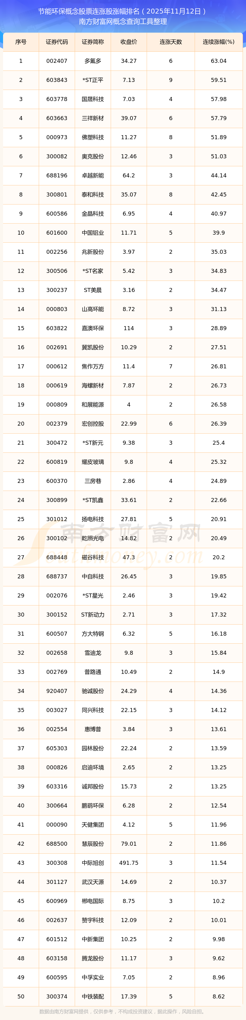 2025年11月12日節(jié)能環(huán)保概念股票連漲股漲幅排名