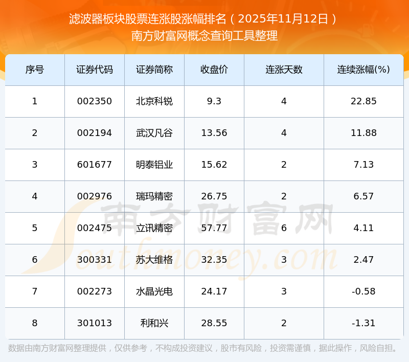 根據(jù)南方財富網(wǎng)概念查詢工具數(shù)據(jù)統(tǒng)計,截止2025年11月12日收盤,濾波器板塊股票共有8只個股實(shí)現(xiàn)連漲。其中連續(xù)漲幅較大的個股有北京科銳、武漢凡谷、明泰鋁業(yè)等,連續(xù)漲幅分別為22.85%、11.88%、7.13%。