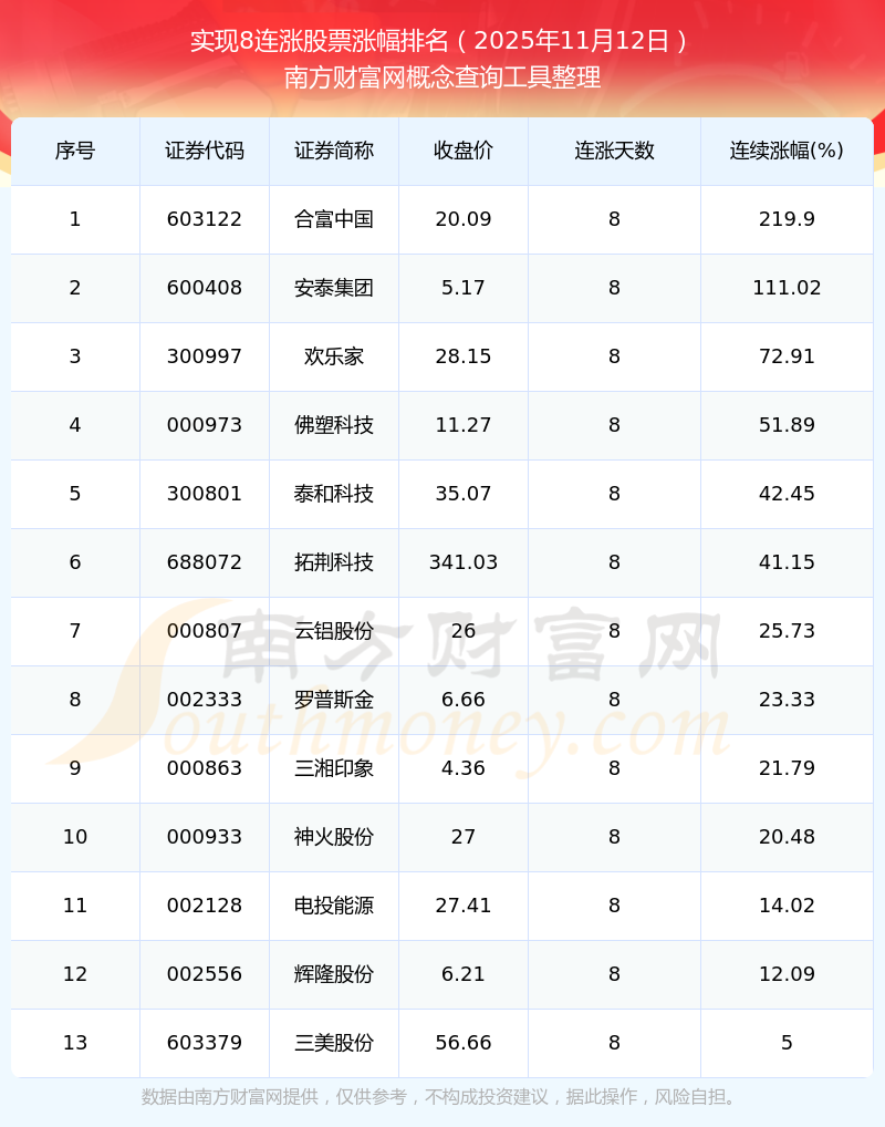 根據(jù)南方財富網(wǎng)概念查詢工具數(shù)據(jù)統(tǒng)計,截止2025年11月12日收盤,共有13只個股實現(xiàn)8天連漲。其中連續(xù)漲幅較大的個股有合富中國、安泰集團、歡樂家等,連續(xù)漲幅分別為219.90%、111.02%、72.91%。