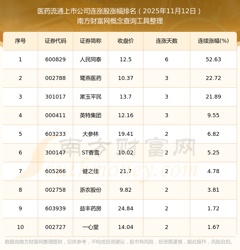 2025年11月12日醫(yī)藥流通上市公司連漲股漲幅排名