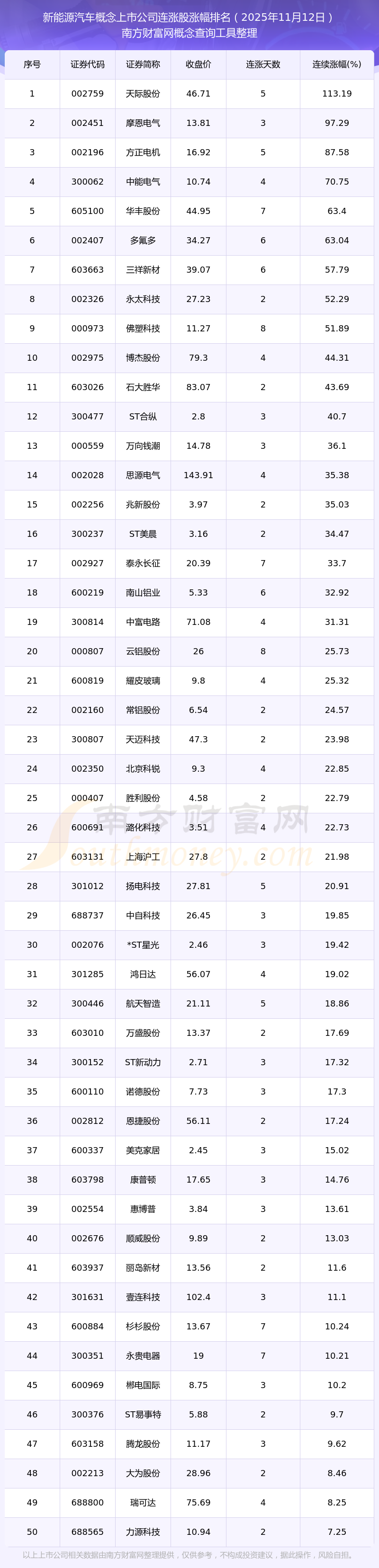 2025年11月12日新能源汽車概念上市公司連漲股漲幅排名