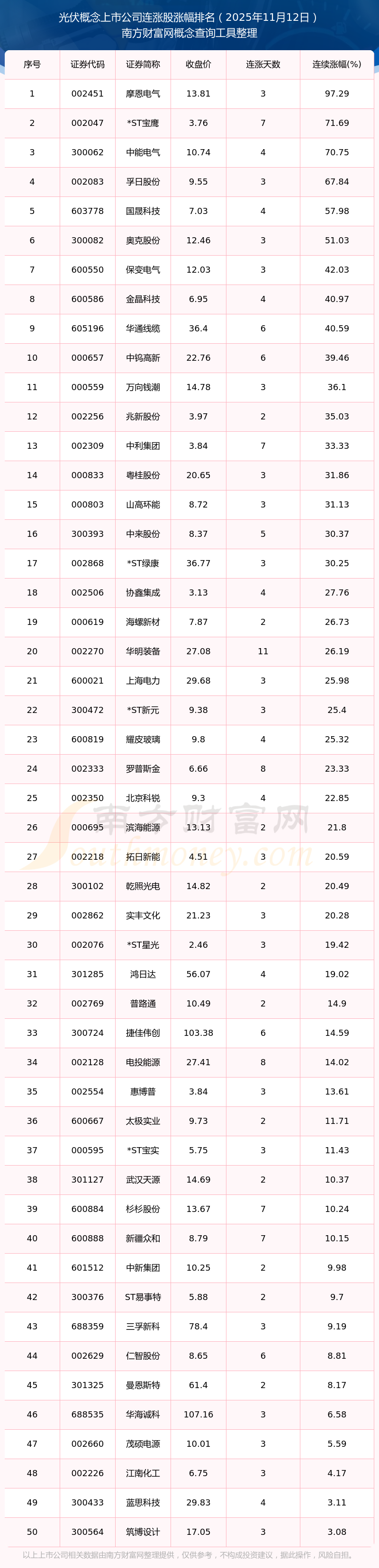 2025年11月12日光伏概念上市公司連漲股漲幅排名