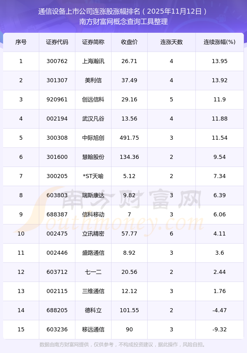 2025年11月12日通信設(shè)備上市公司連漲股漲幅排名