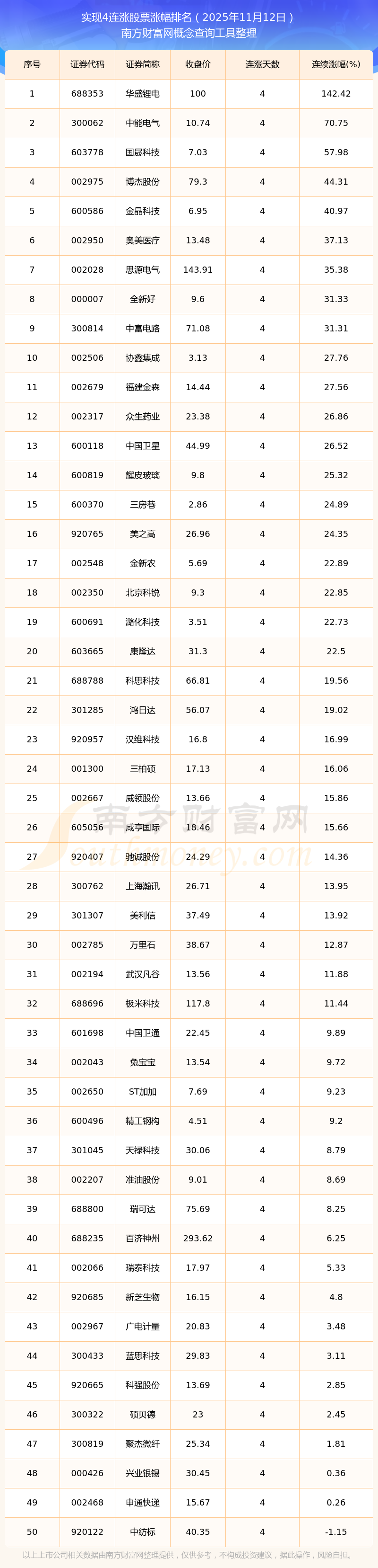 根據(jù)南方財(cái)富網(wǎng)概念查詢工具數(shù)據(jù)統(tǒng)計(jì),截止2025年11月12日收盤,共有51只個(gè)股實(shí)現(xiàn)4天連漲。其中連續(xù)漲幅較大的個(gè)股有華盛鋰電、中能電氣、國(guó)晟科技等,連續(xù)漲幅分別為142.42%、70.75%、57.98%。
