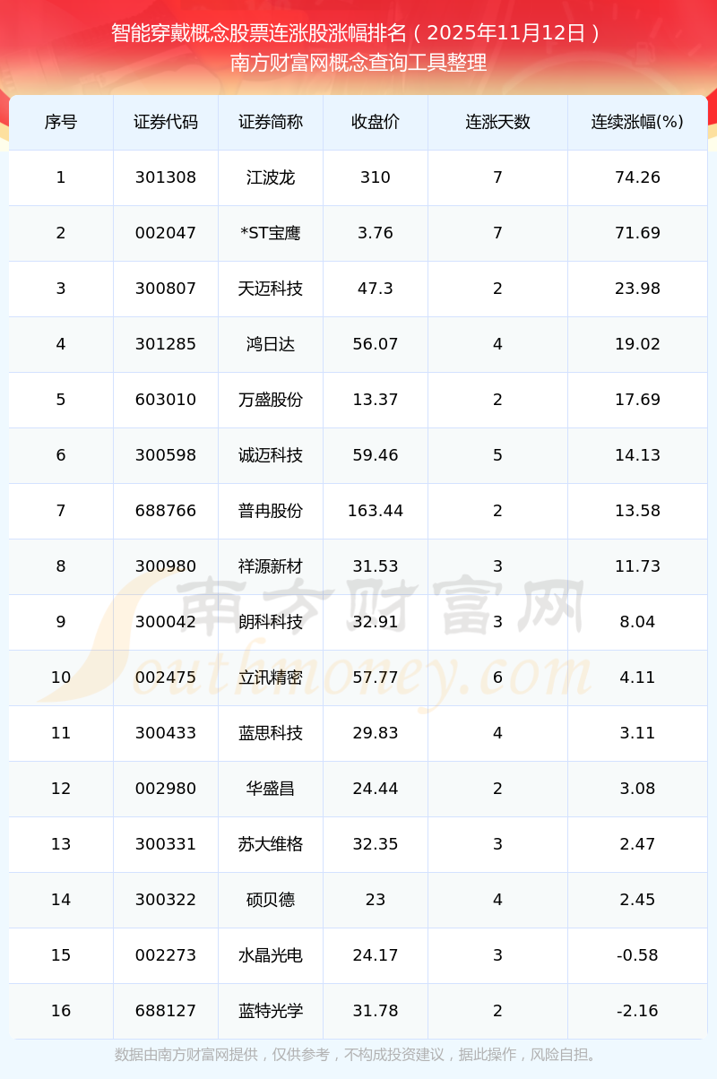 根據(jù)南方財(cái)富網(wǎng)概念查詢(xún)工具數(shù)據(jù)統(tǒng)計(jì),截止2025年11月12日收盤(pán),智能穿戴概念股票共有16只個(gè)股實(shí)現(xiàn)連漲。其中連續(xù)漲幅較大的個(gè)股有江波龍、*ST寶鷹、天邁科技等,連續(xù)漲幅分別為74.26%、71.69%、23.98%。