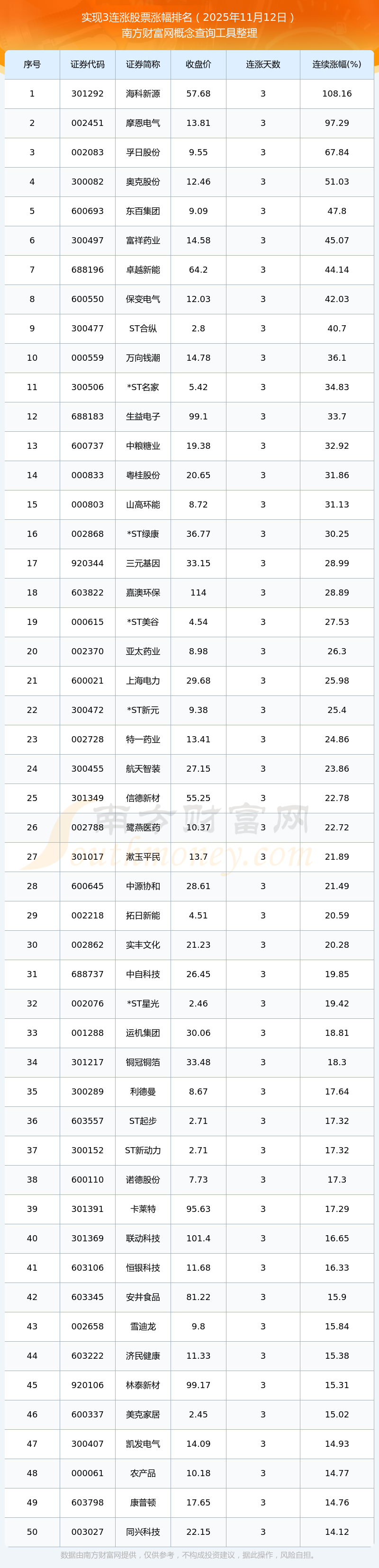 2025年11月12日實(shí)現(xiàn)3連漲股票漲幅排名