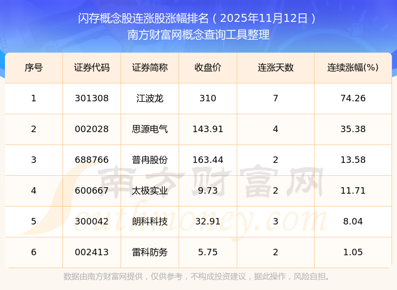 根據(jù)南方財富網(wǎng)概念查詢工具數(shù)據(jù)統(tǒng)計,截止2025年11月12日收盤,閃存概念股共有6只個股實現(xiàn)連漲。其中連續(xù)漲幅較大的個股有江波龍、思源電氣、普冉股份等,連續(xù)漲幅分別為74.26%、35.38%、13.58%。