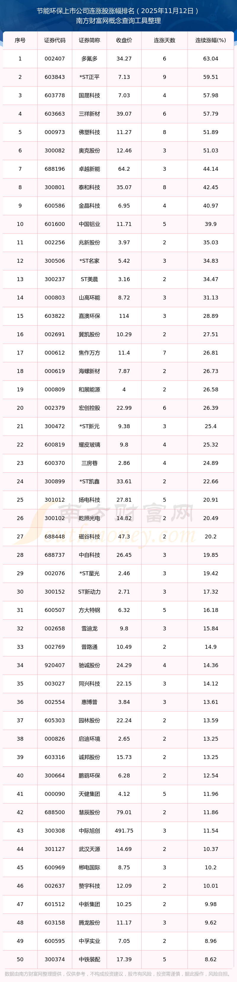 2025年11月12日節(jié)能環(huán)保上市公司連漲股漲幅排名