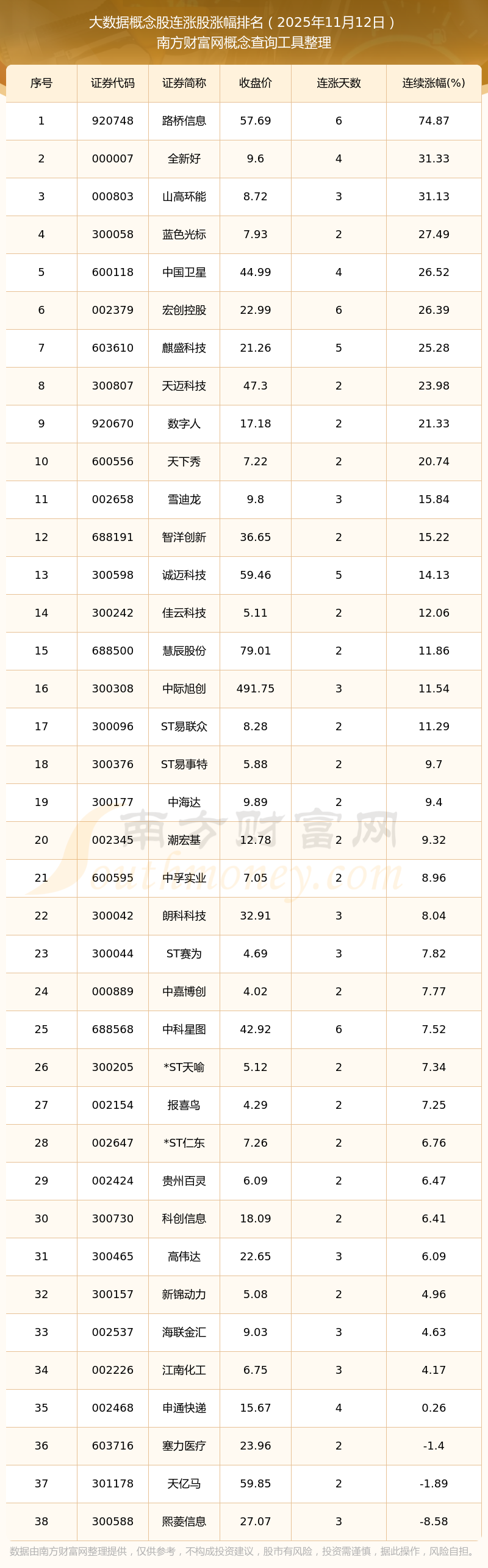 2025年11月12日大數(shù)據(jù)概念股連漲股漲幅排名