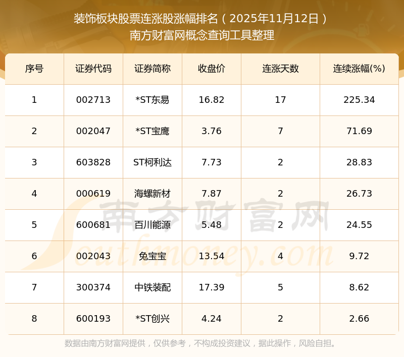 2025年11月12日裝飾板塊股票連漲股票漲幅排名