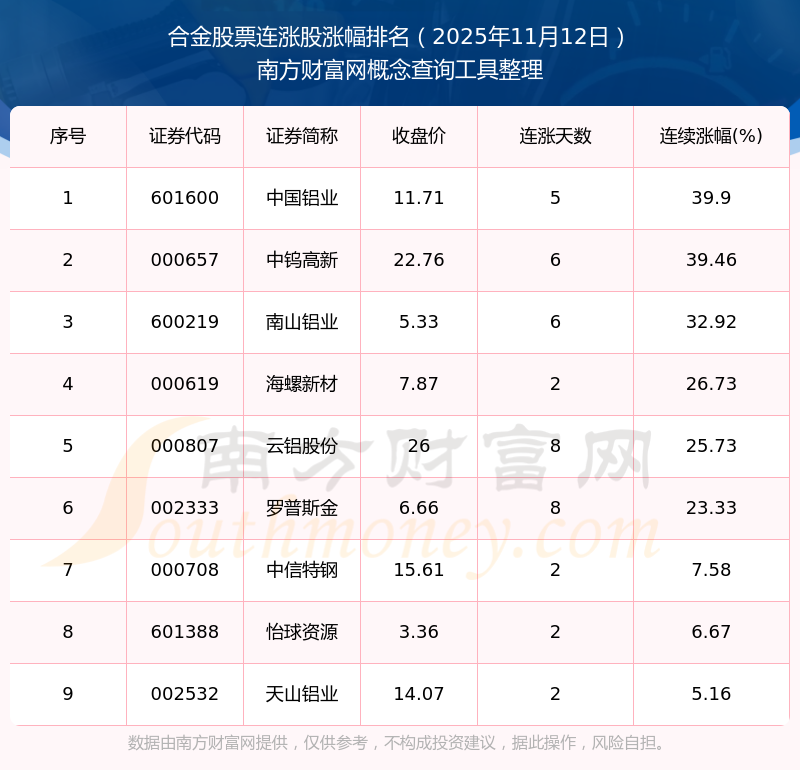 2025年11月12日合金股票連漲股漲幅排名