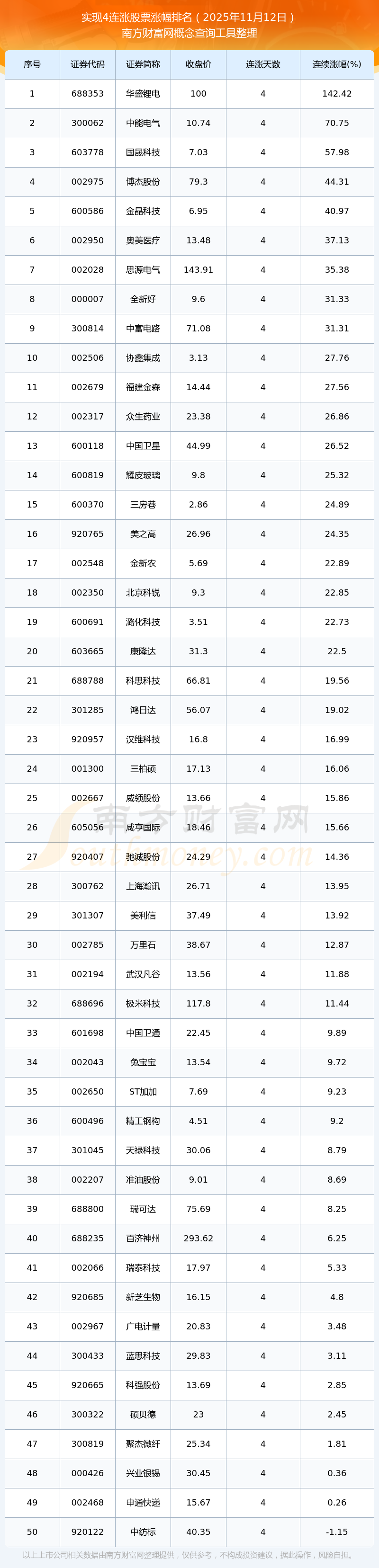 2025年11月12日實現(xiàn)4連漲股票漲幅排名