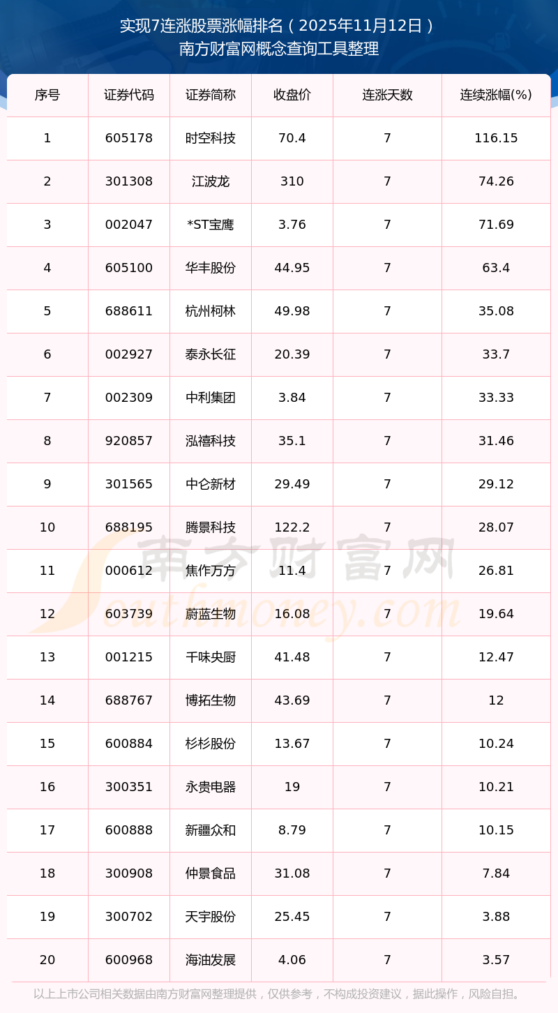 2025年11月12日實(shí)現(xiàn)7連漲股票漲幅排名