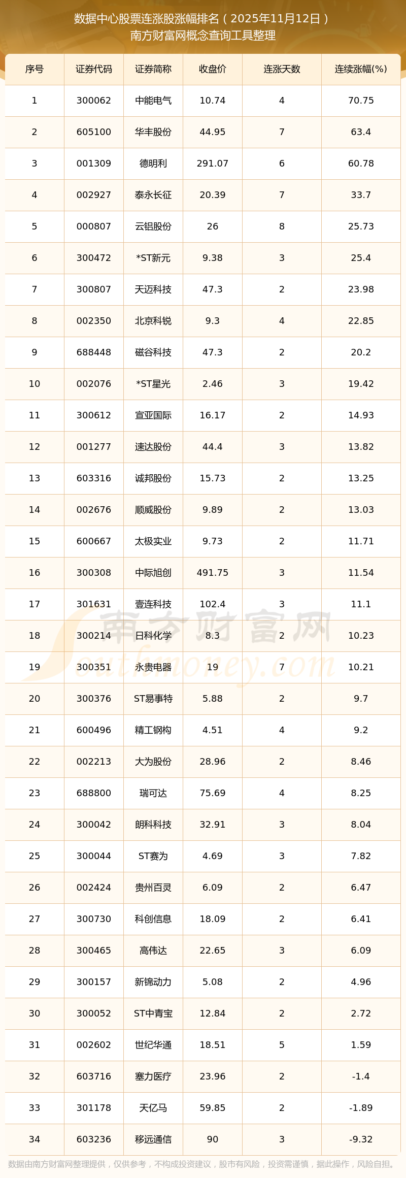 2025年11月12日數(shù)據(jù)中心股票連漲股漲幅排名