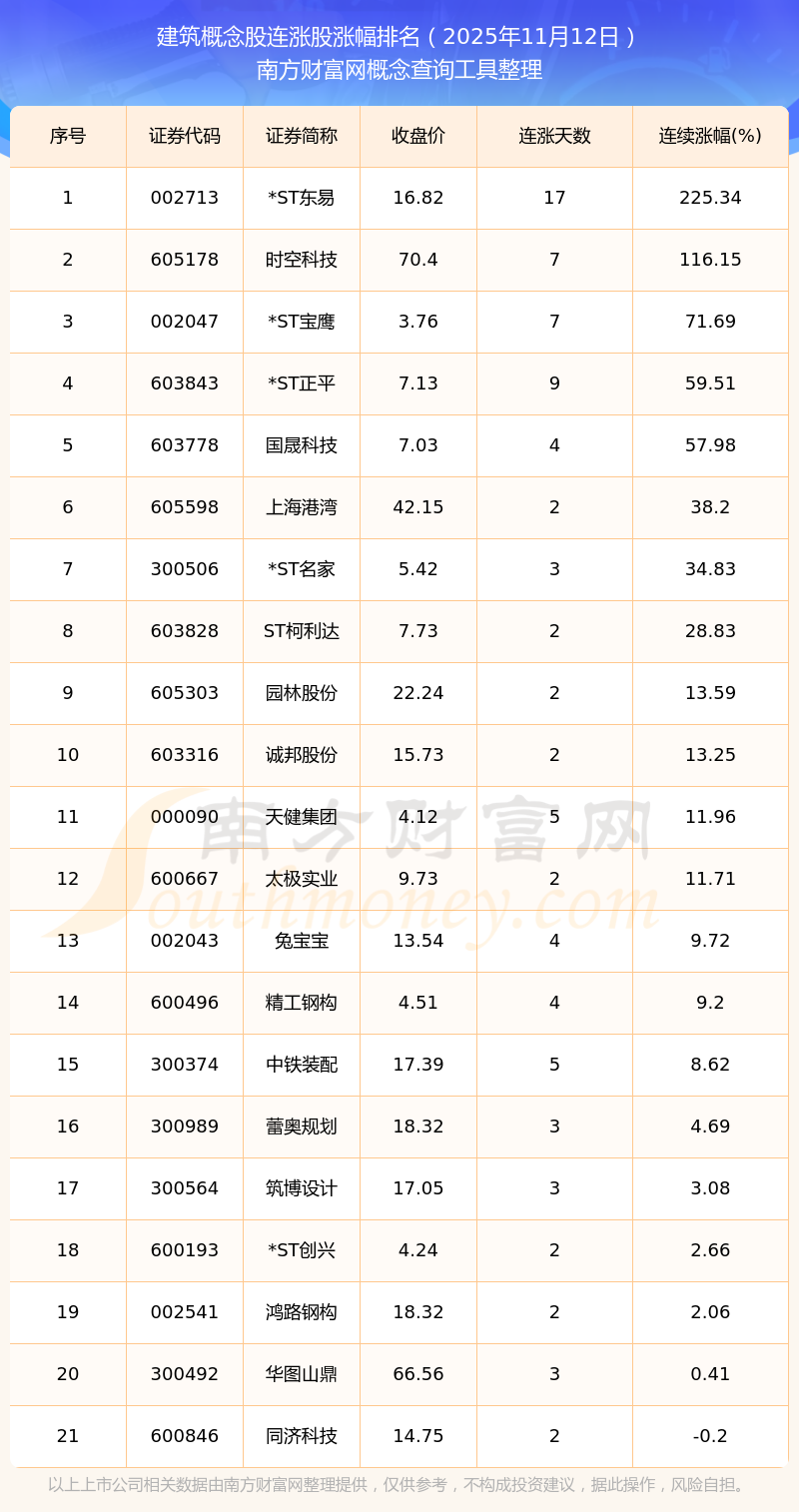 根據(jù)南方財(cái)富網(wǎng)概念查詢(xún)工具數(shù)據(jù)統(tǒng)計(jì),截止2025年11月12日收盤(pán),建筑概念股共有21只個(gè)股實(shí)現(xiàn)連漲。其中連續(xù)漲幅較大的個(gè)股有*ST東易、時(shí)空科技、*ST寶鷹等,連續(xù)漲幅分別為225.34%、116.15%、71.69%。