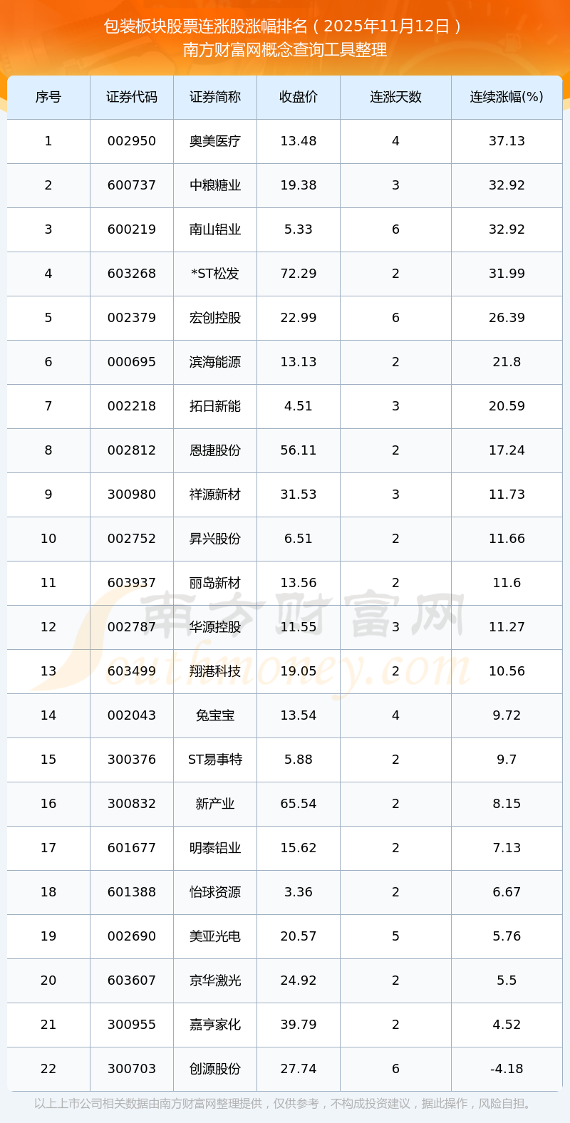 2025年11月12日包裝板塊股票連漲股漲幅排名