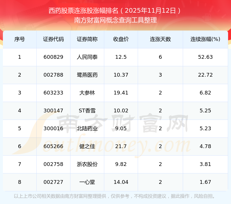 根據(jù)南方財富網(wǎng)概念查詢工具數(shù)據(jù)統(tǒng)計,截止2025年11月12日收盤,西藥股票共有8只個股實現(xiàn)連漲。其中連續(xù)漲幅較大的個股有人民同泰、鷺燕醫(yī)藥、大參林等,連續(xù)漲幅分別為52.63%、22.72%、6.82%。