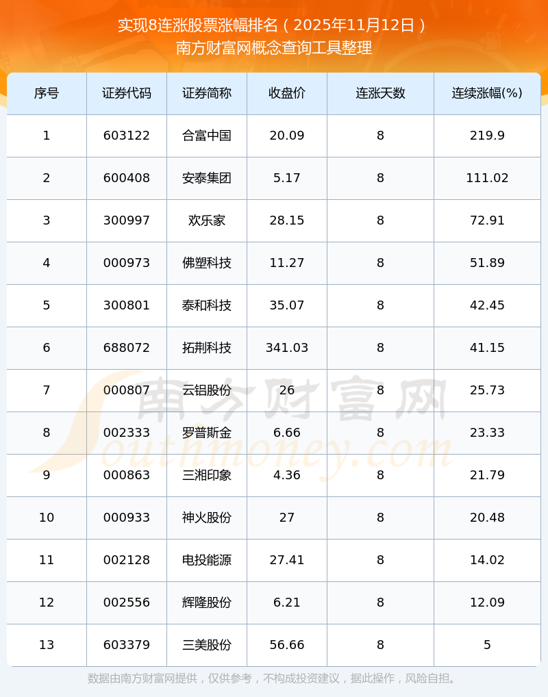 2025年11月12日實現(xiàn)8連漲股票漲幅排名