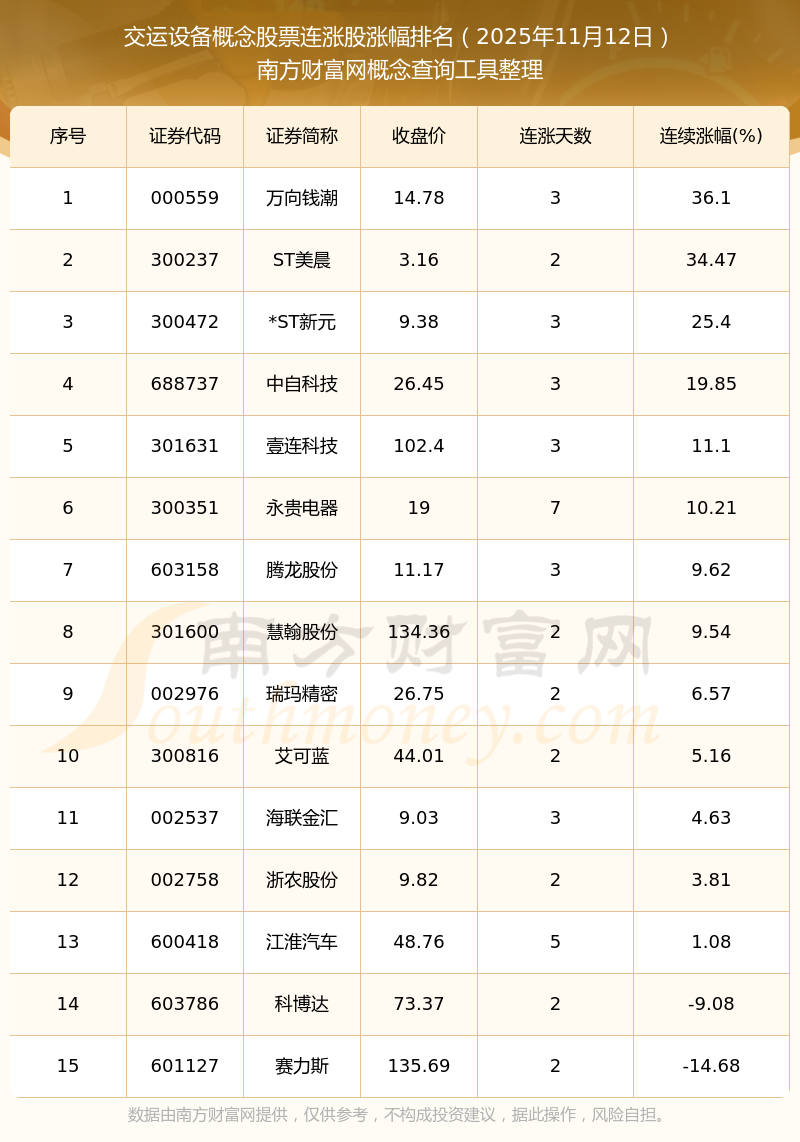 2025年11月12日交運(yùn)設(shè)備概念股票連漲股漲幅排名