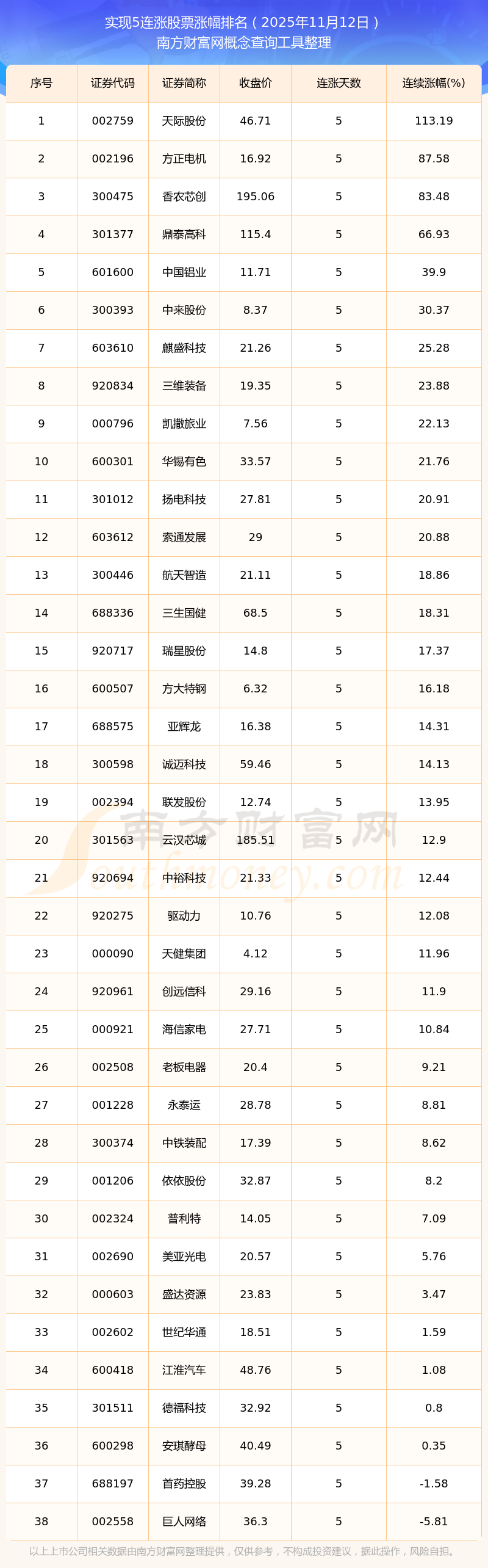 根據(jù)南方財(cái)富網(wǎng)概念查詢工具數(shù)據(jù)統(tǒng)計(jì),截止2025年11月12日收盤,共有38只個股實(shí)現(xiàn)5天連漲。其中連續(xù)漲幅較大的個股有天際股份、方正電機(jī)、香農(nóng)芯創(chuàng)等,連續(xù)漲幅分別為113.19%、87.58%、83.48%。