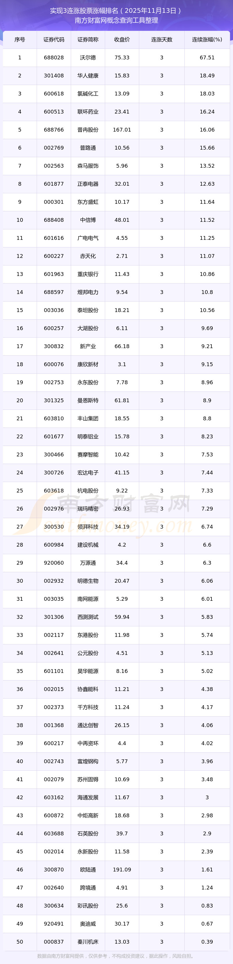 2025年11月13日實現(xiàn)3連漲股票漲幅排名