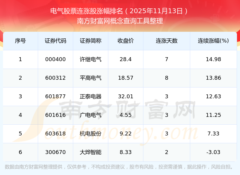 2025年11月13日電氣股票連漲股漲幅排名