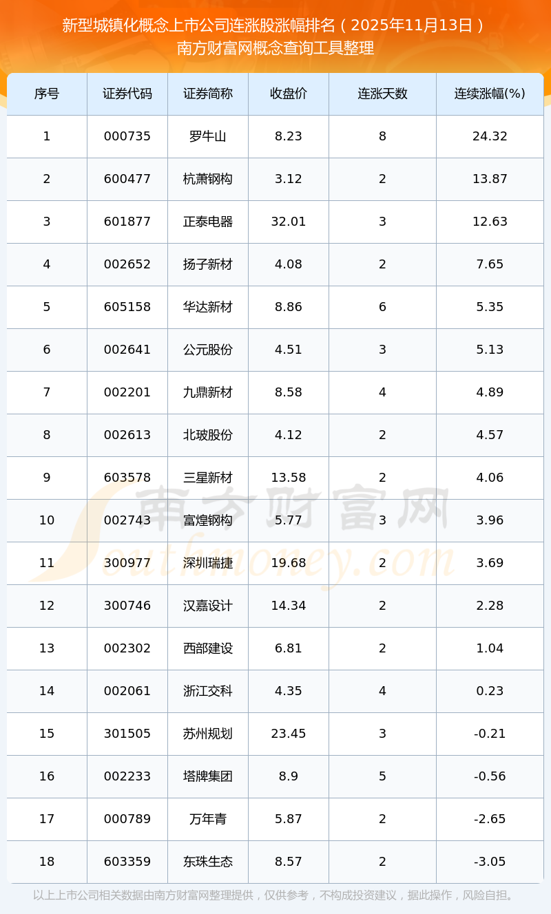 2025年11月13日新型城鎮(zhèn)化概念上市公司連漲股漲幅排名