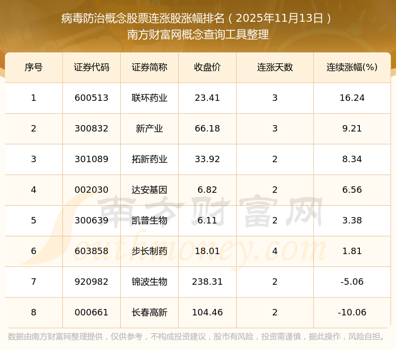 根據(jù)南方財富網(wǎng)概念查詢工具數(shù)據(jù)統(tǒng)計,截止2025年11月13日收盤,病毒防治概念股票共有8只個股實現(xiàn)連漲。其中連續(xù)漲幅較大的個股有聯(lián)環(huán)藥業(yè)、新產(chǎn)業(yè)、拓新藥業(yè)等,連續(xù)漲幅分別為16.24%、9.21%、8.34%。